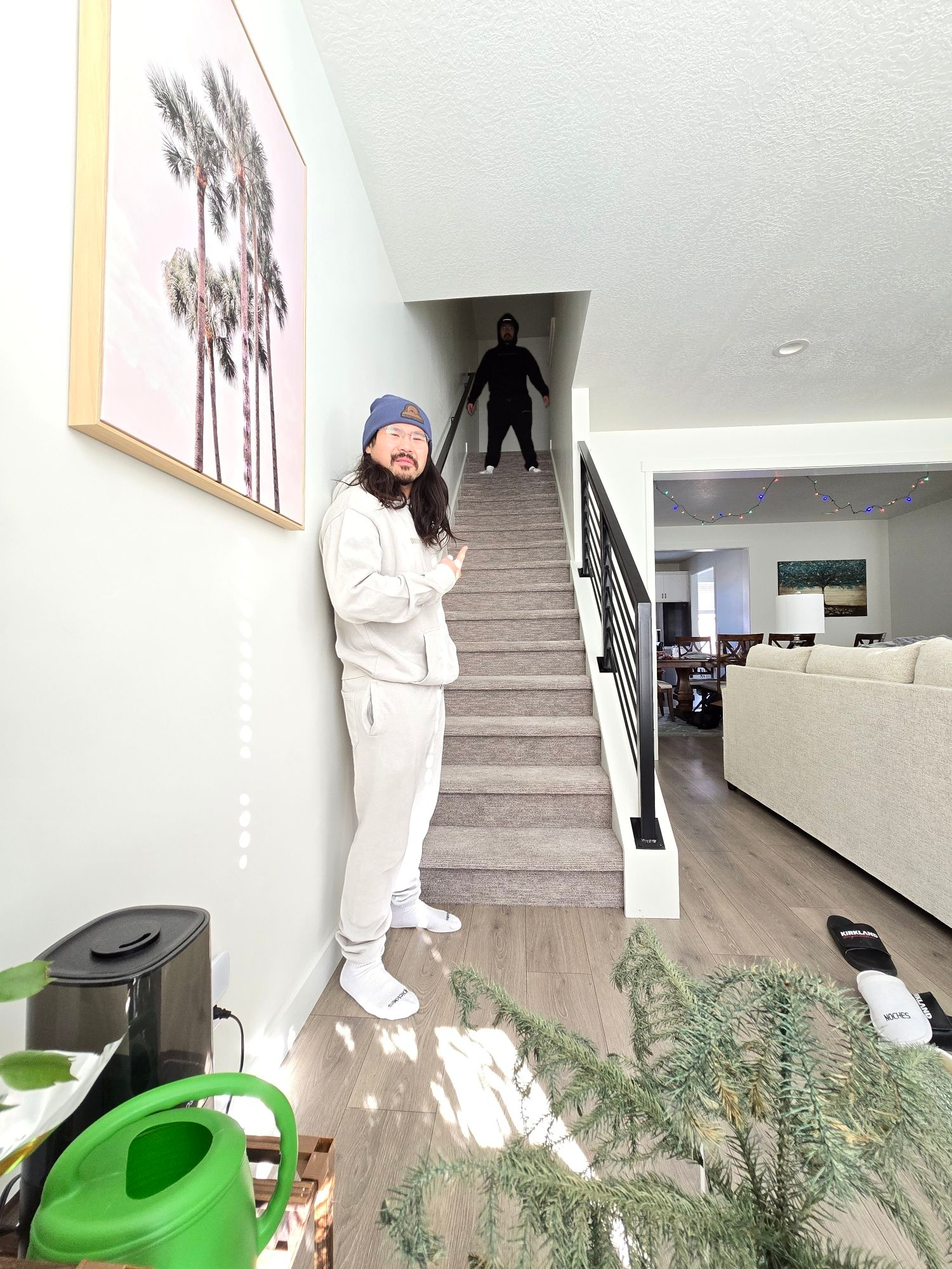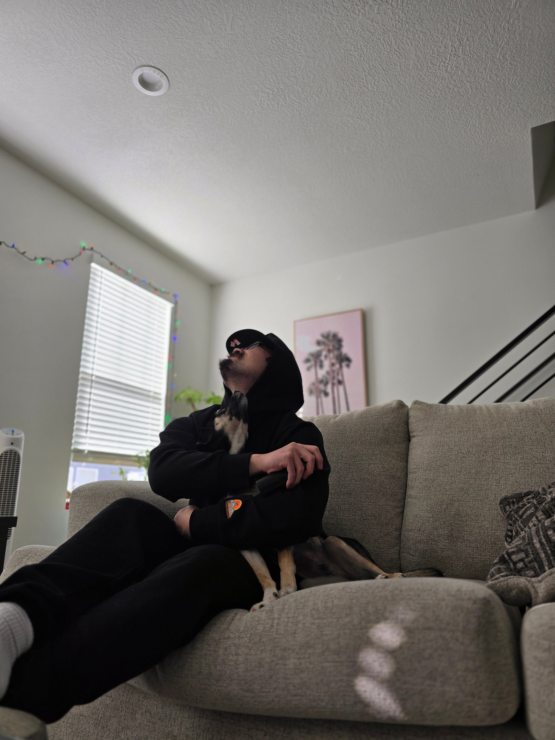 He is 190lbs, 5'8" wearing a Black L and Lunar Rock M